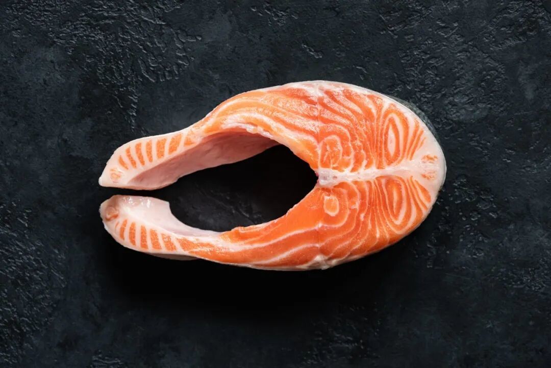 从三文鱼排切片可以清楚地看到其内部的脂肪沉积规律:腹部最肥,腰背部次之 / 图虫创意