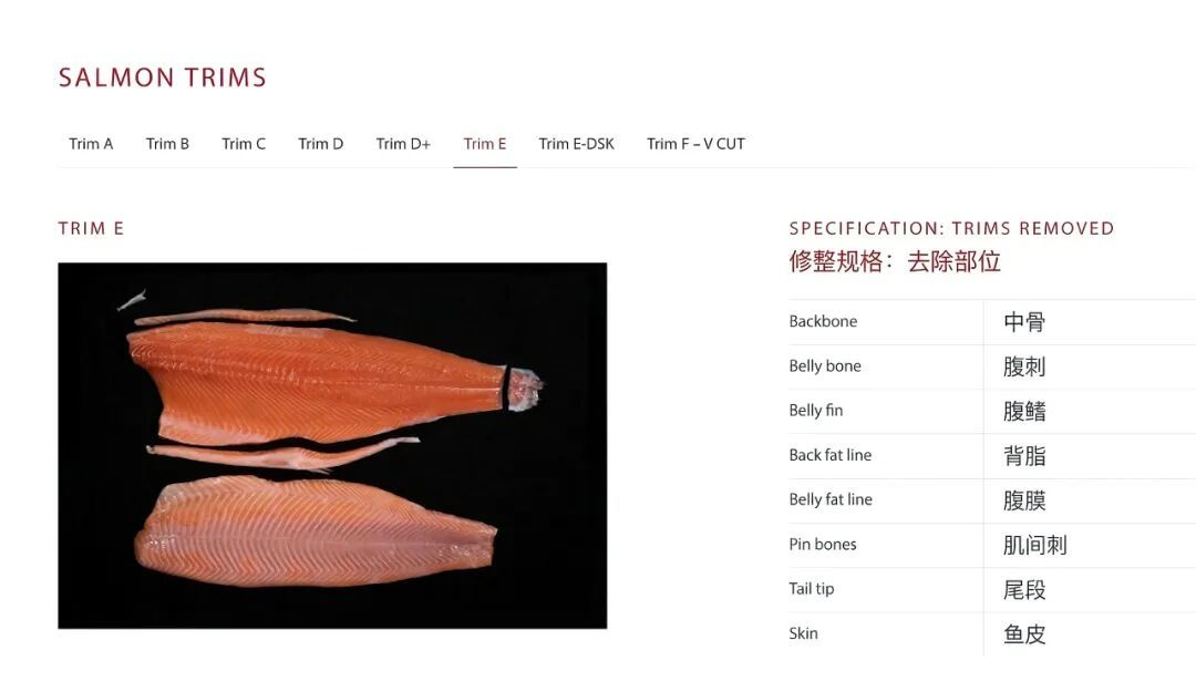 修整三文鱼有一套行业内约定俗成的标准,按照TrimA到E,一共划分了5个等级。TrimA保留的部位最多,通常只是去掉鱼头、中骨、腹刺等基础结构;等级越往后,修得越干净,会逐步去掉腹鳍、背鳍、腹边、筋膜等边角料[13]。